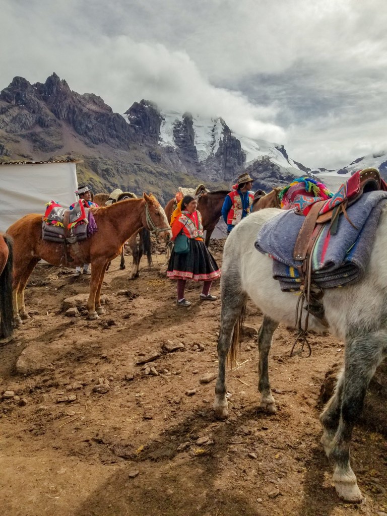 The Rainbow Mountain were discovered because the snow that covered them melted off due to global warming. The melt off exposed the beautiful colors of the mountains. With that being said the Rainbow Mountain is cold. Like really cold. The surrounding mountains are still covered in snow. I didn’t dress properly so I had to buy an extra sweater, leg warmers and gloves but I was still freezing. The good news is that there are vendors at the entrance of the mountain selling all kinds of warm clothing in case you feel cold. FYI the clothing is not good quality but it serves it’s purpose.